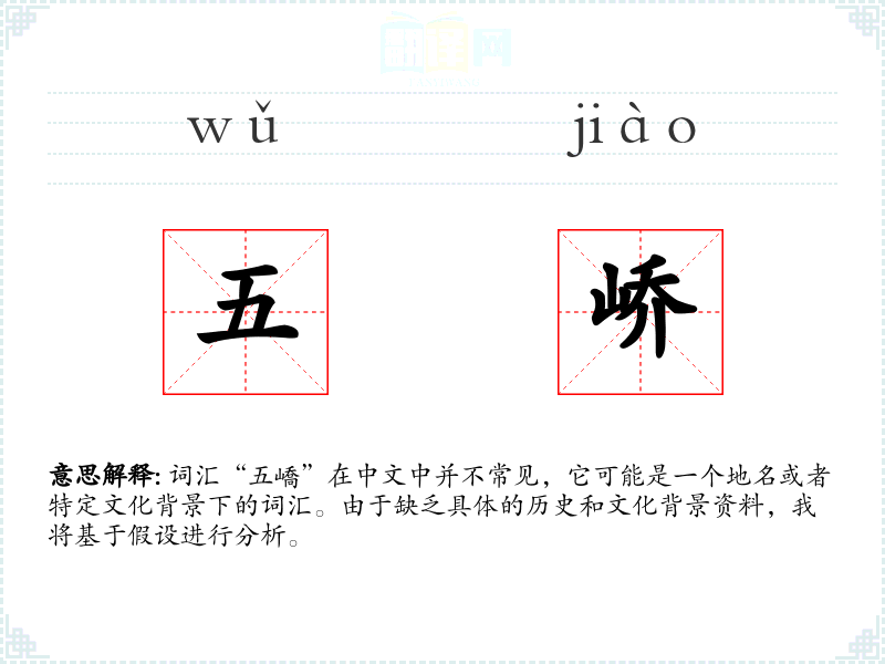 词汇“五嶠”在中文中并不常见,它可能是一个地名或者特定文化背景下的词汇。由于缺乏具体的历史和文化背景资料,我将基于假设进行分析。