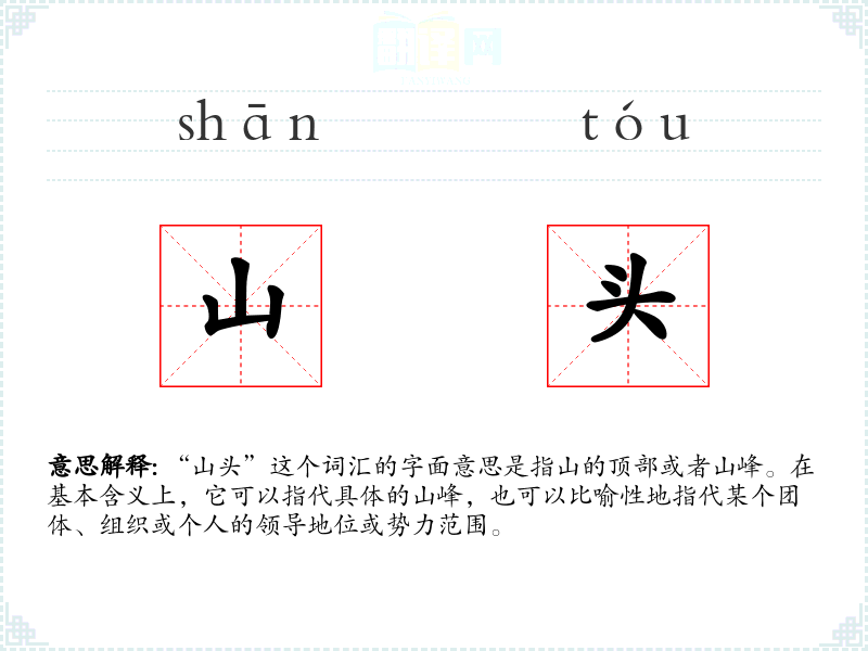 “山头”这个词汇的字面意思是指山的顶部或者山峰。在基本含义上,它可以指代具体的山峰,也可以比喻性地指代某个团体、组织或个人的领导地位或势力范围。