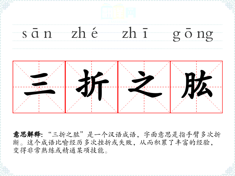 “三折之肱”出自《左传·宣公十五年》:“三折肱,知为良医。”原意是指多次折断手臂的人,因为经历了痛苦和治疗,所以对医术有深刻的理解。随着时间的推移,这个成语的含义扩展到任何通过多次失败和尝试获得专业技能的情景。