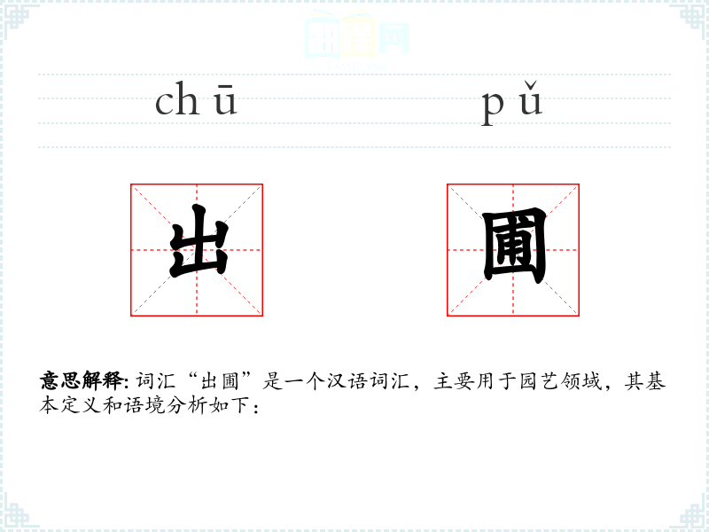 词汇“出圃”是一个汉语词汇,主要用于园艺领域,其基本定义和语境分析如下: