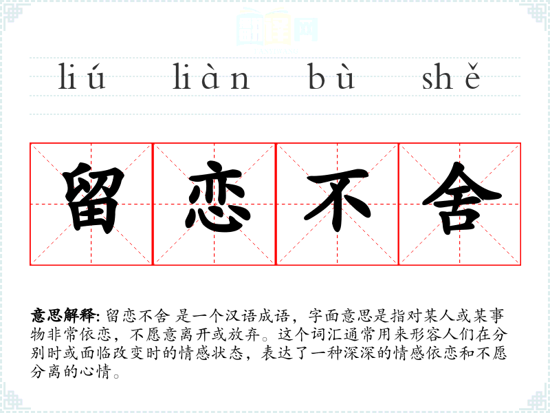 留恋不舍 是一个汉语成语,字面意思是指对某人或某事物非常依恋,不愿意离开或放弃。这个词汇通常用来形容人们在分别时或面临改变时的情感状态,表达了一种深深的情感依恋和不愿分离的心情。