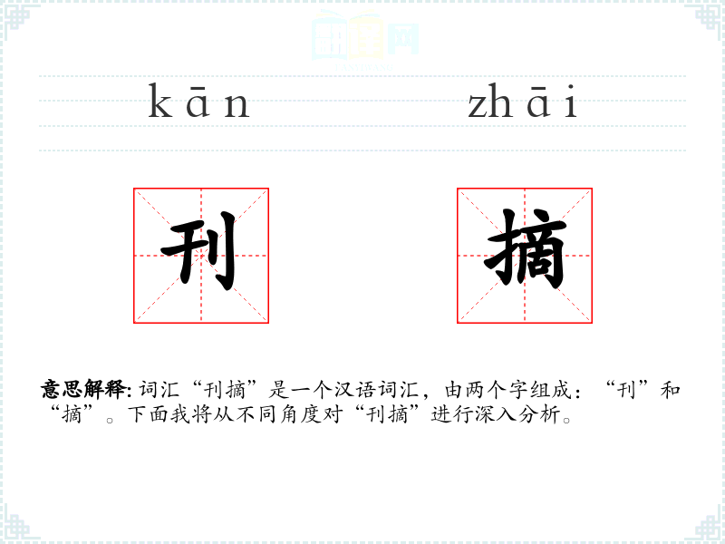 “刊”字古已有之,原指刻写或雕刻,后引申为出版、发表。“摘”字则指选取、摘录。两者结合形成“刊摘”,强调从已有出版物中选取内容进行再发表。