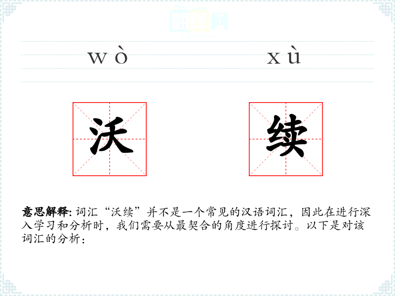 由于“沃续”不是一个标准词汇,我们无法提供一个确切的基本定义。但从字面意思来看,“沃”通常与肥沃、丰富相关,而“续”则意味着继续、延续。因此,“沃续”可能意味着某种丰富或肥沃状态的持续或延续。