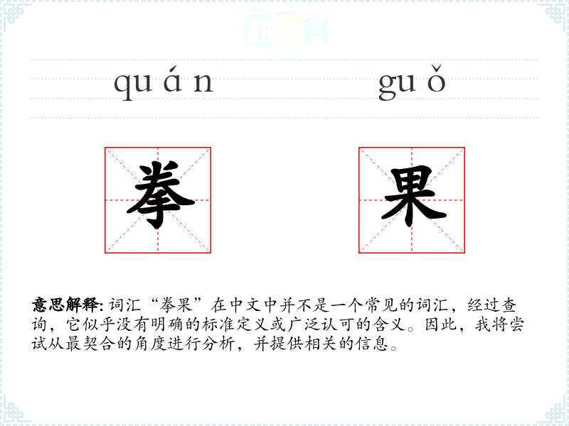 由于“拳果”不是一个标准词汇,我们无法提供一个确切的基本定义。它可能是某个特定领域或方言中的词汇,或者是某个特定社群中的俚语。