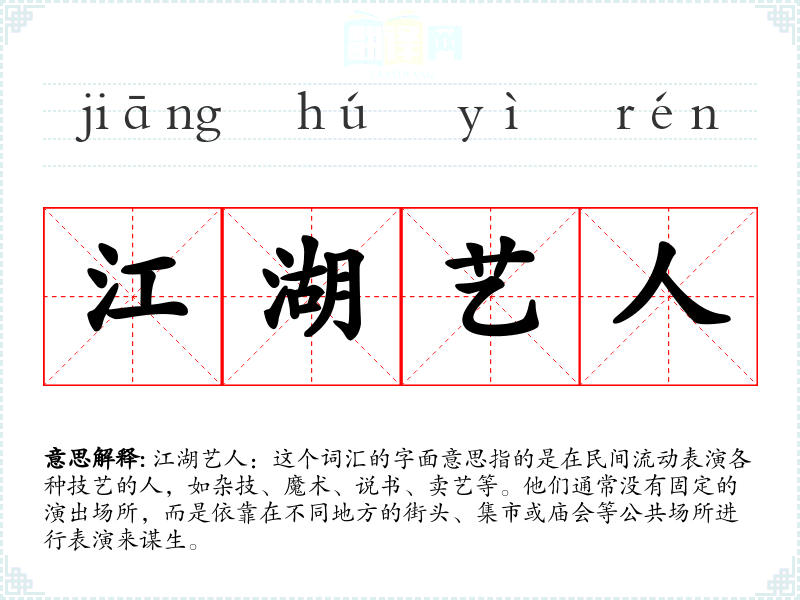 江湖艺人:这个词汇的字面意思指的是在民间流动表演各种技艺的人,如杂技、魔术、说书、卖艺等。他们通常没有固定的演出场所,而是依靠在不同地方的街头、集市或庙会等公共场所进行表演来谋生。