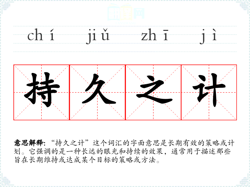 “持久之计”这个词汇的字面意思是长期有效的策略或计划。它强调的是一种长远的眼光和持续的效果,通常用于描述那些旨在长期维持或达成某个目标的策略或方法。