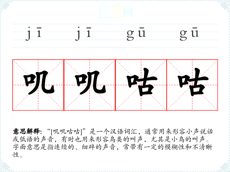 “叽叽咕咕”这个词汇的词源较为模糊,可能是由模拟声音的拟声词演变而来。在古代汉语中,类似的拟声词常用来形容各种声音,随着语言的发展,这些词汇逐渐固定下来,用于特定的语境。