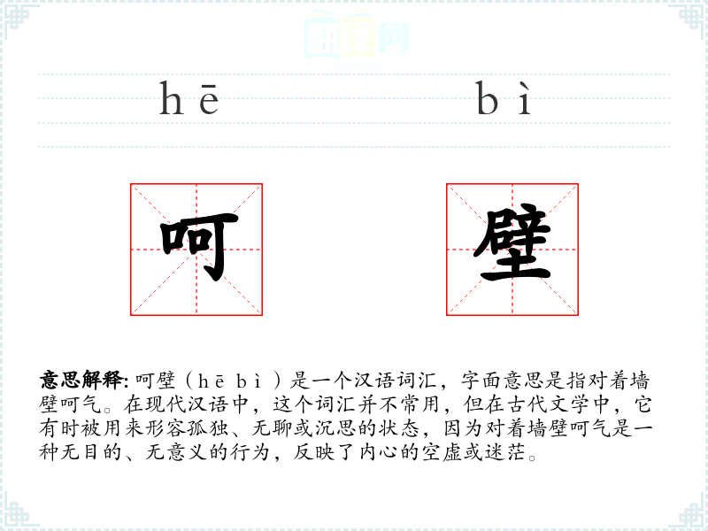 呵壁(hē bì)是一个汉语词汇,字面意思是指对着墙壁呵气。在现代汉语中,这个词汇并不常用,但在古代文学中,它有时被用来形容孤独、无聊或沉思的状态,因为对着墙壁呵气是一种无目的、无意义的行为,反映了内心的空虚或迷茫。