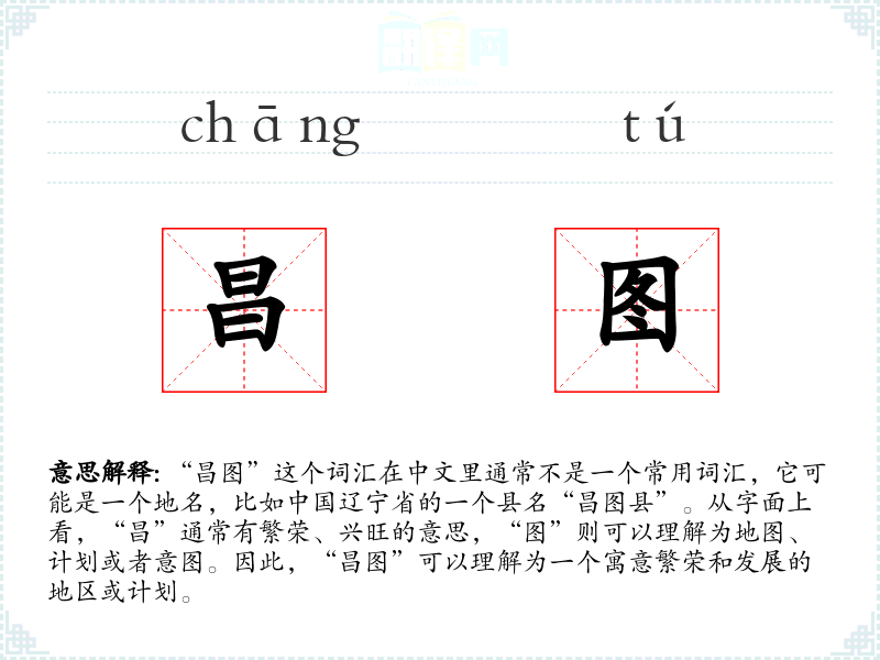由于“昌图”是一个具体的中文地名,它在其他语言或文化中可能没有直接对应的词汇。在翻译时,可能需要根据上下文来选择合适的表达。