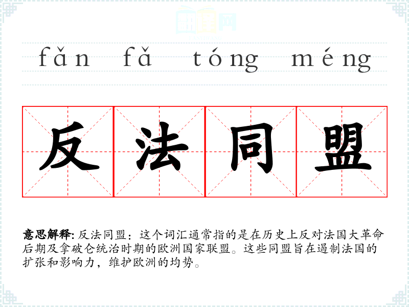 - 词源:这个词汇源自法语“coalition anti-française”,直接翻译为“反法同盟”。