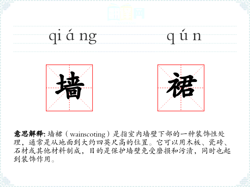 - 反义词:无(因为墙裙是一种特定的装饰方式,没有直接的反义词)