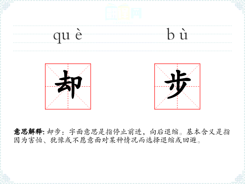 却步:字面意思是指停止前进,向后退缩。基本含义是指因为害怕、犹豫或不愿意面对某种情况而选择退缩或回避。