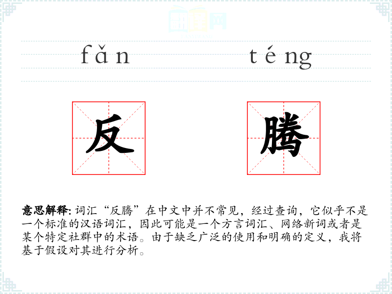 词汇“反腾”在中文中并不常见,经过查询,它似乎不是一个标准的汉语词汇,因此可能是一个方言词汇、网络新词或者是某个特定社群中的术语。由于缺乏广泛的使用和明确的定义,我将基于假设对其进行分析。