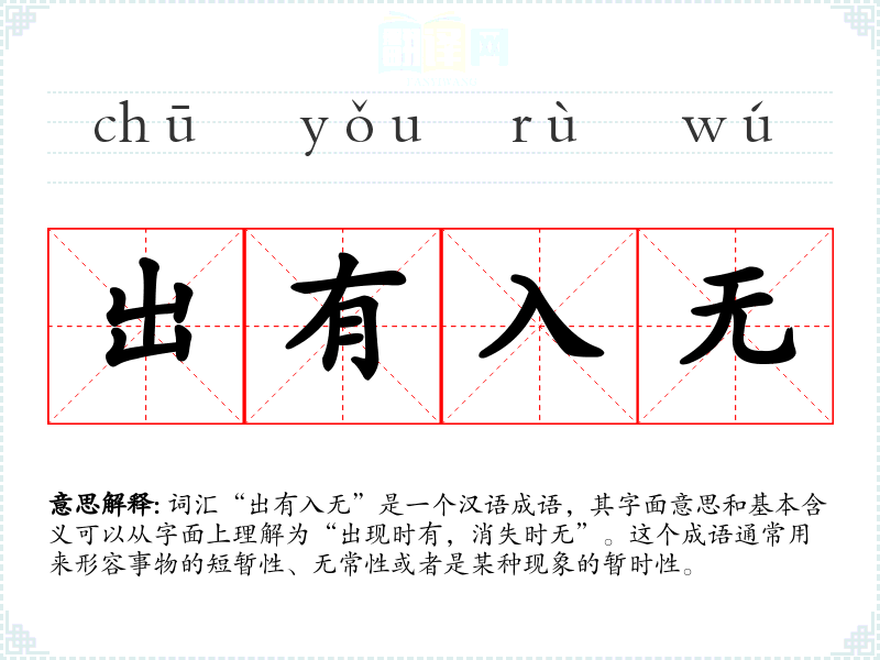 词汇“出有入无”是一个汉语成语,其字面意思和基本含义可以从字面上理解为“出现时有,消失时无”。这个成语通常用来形容事物的短暂性、无常性或者是某种现象的暂时性。