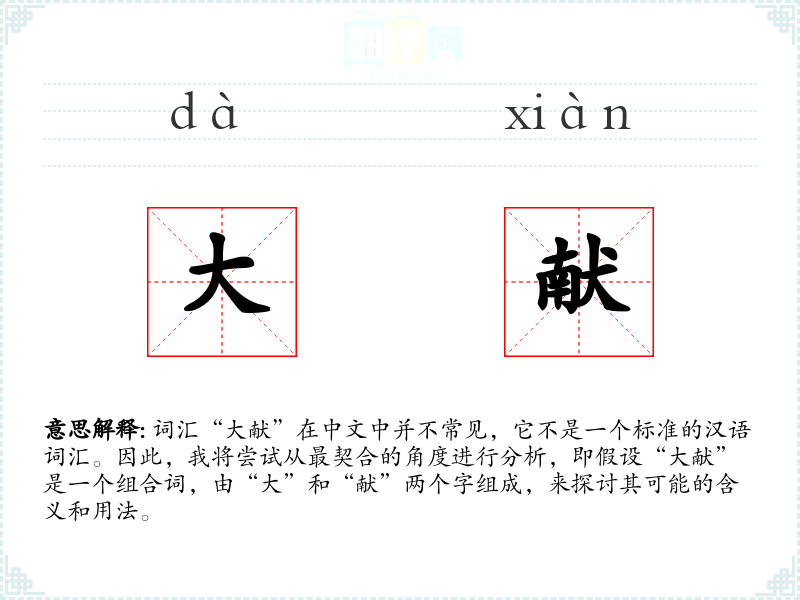 词汇“大献”在中文中并不常见,它不是一个标准的汉语词汇。因此,我将尝试从最契合的角度进行分析,即假设“大献”是一个组合词,由“大”和“献”两个字组成,来探讨其可能的含义和用法。