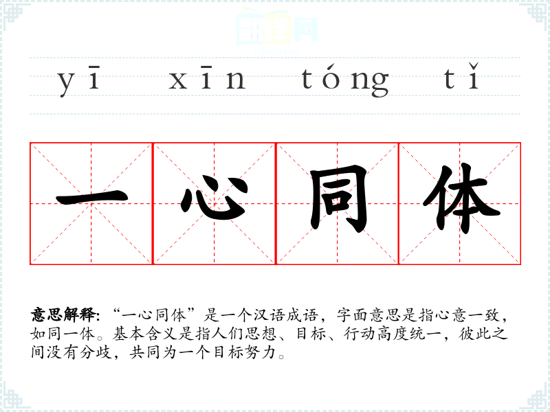 “一心同体”是一个汉语成语,字面意思是指心意一致,如同一体。基本含义是指人们思想、目标、行动高度统一,彼此之间没有分歧,共同为一个目标努力。