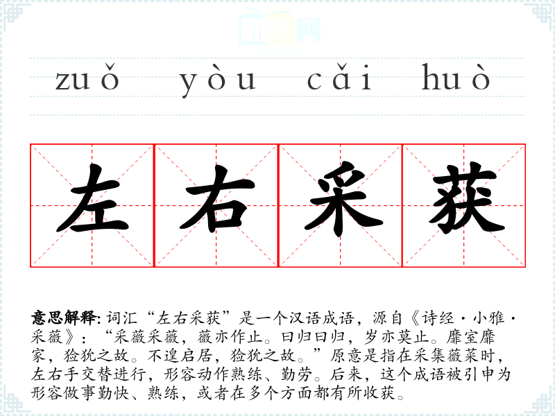 - 理解:“左右采获”这个成语不仅形容动作熟练,还蕴含了对勤劳美德的赞美。