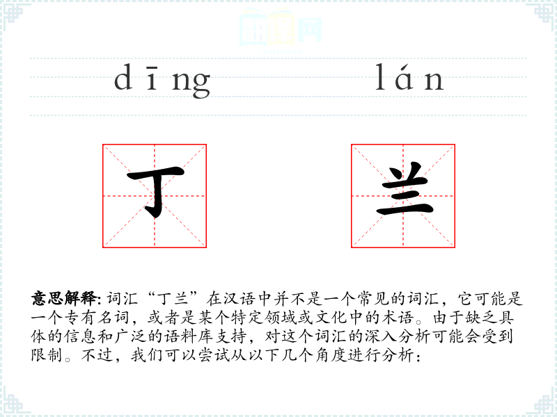由于“丁兰”不是一个常见的词汇,我们无法对其进行深入的分析和总结。在语言学习和表达中,了解和掌握常见词汇和术语更为重要。对于不常见的词汇,我们需要更多的信息和语境支持才能进行有效的学习和分析。
