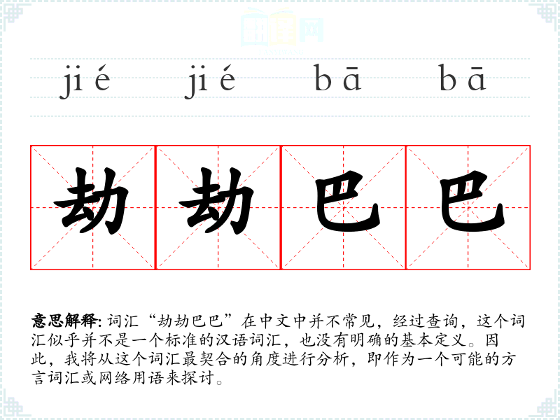 由于“劫劫巴巴”不是一个标准的汉语词汇,我们无法给出一个确切的字面意思和基本含义。它可能是某个地区方言中的词汇,或者是网络上的新兴用语,具体含义需要结合具体语境来理解。