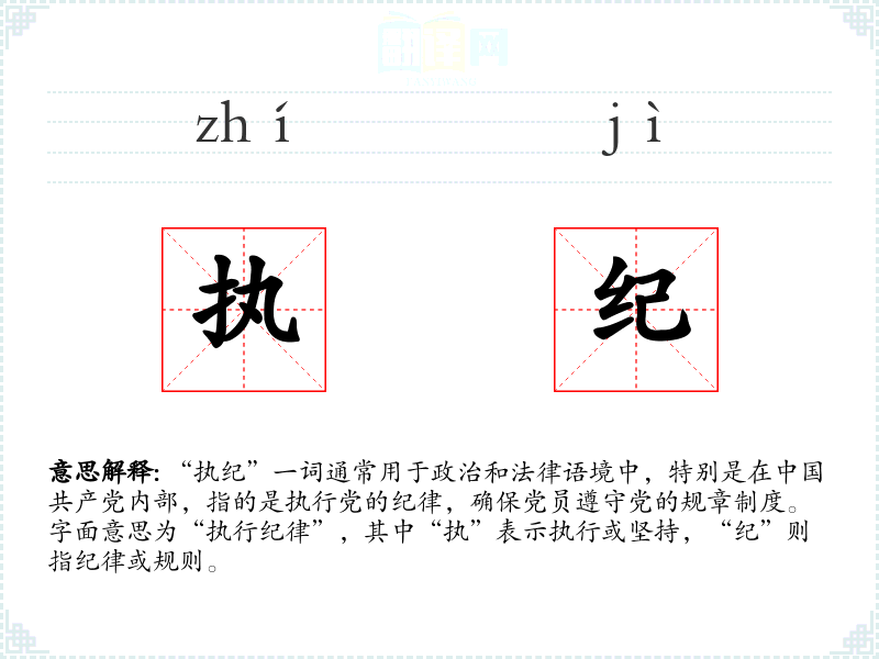 “执纪”一词通常用于政治和法律语境中,特别是在**共产党内部,指的是执行党的纪律,确保党员遵守党的规章制度。字面意思为“执行纪律”,其中“执”表示执行或坚持,“纪”则指纪律或规则。