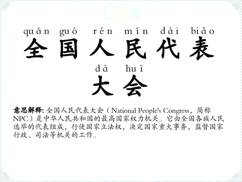 全国人民代表大会(National People's Congress,简称NPC)是中华人民共和国的最高国家权力机关。它由全国各族人民选举的代表组成,行使国家立法权,决定国家重大事务,监督国家行政、司法等机关的工作。