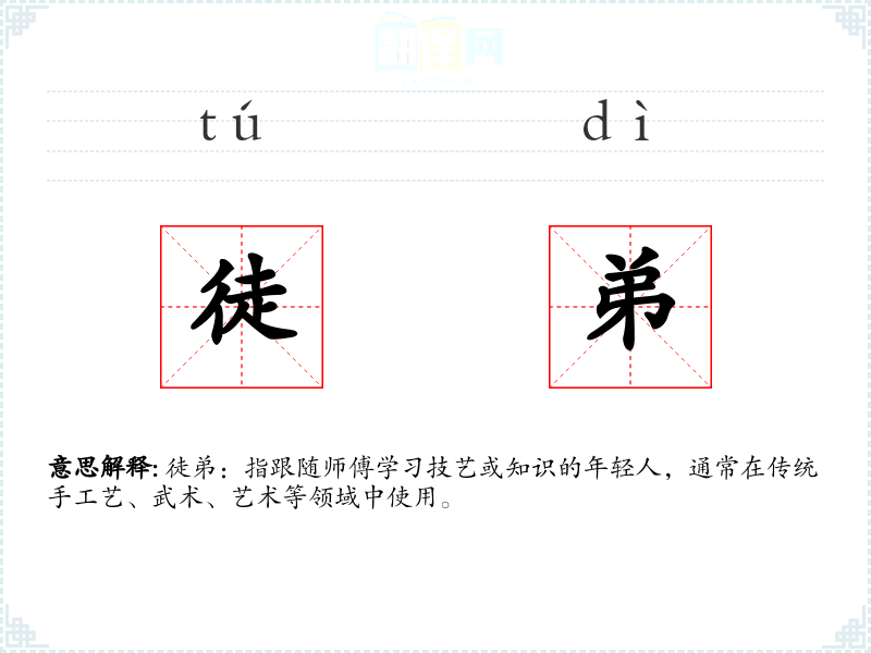 徒弟:指跟随师傅学*技艺或知识的年轻人,通常在传统手工艺、武术、艺术等领域中使用。