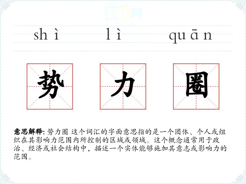 势力圈 这个词汇的字面意思指的是一个团体、个人或组织在其影响力范围内所控制的区域或领域。这个概念通常用于政治、经济或社会结构中,描述一个实体能够施加其意志或影响力的范围。