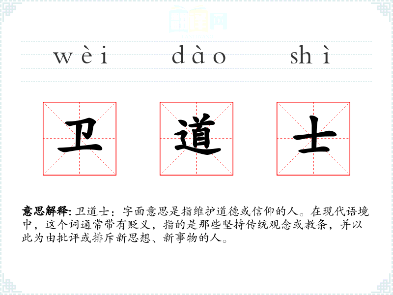 卫道士:字面意思是指维护道德或信仰的人。在现代语境中,这个词通常带有贬义,指的是那些坚持传统观念或教条,并以此为由批评或排斥新思想、新事物的人。