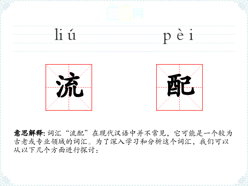词汇“流配”在现代汉语中并不常见,它可能是一个较为古老或专业领域的词汇。为了深入学*和分析这个词汇,我们可以从以下几个方面进行探讨: