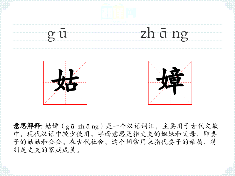 姑嫜(gū zhāng)是一个汉语词汇,主要用于古代文献中,现代汉语中较少使用。字面意思是指丈夫的姐妹和父母,即妻子的姑姑和公公。在古代社会,这个词常用来指代妻子的亲属,特别是丈夫的家庭成员。