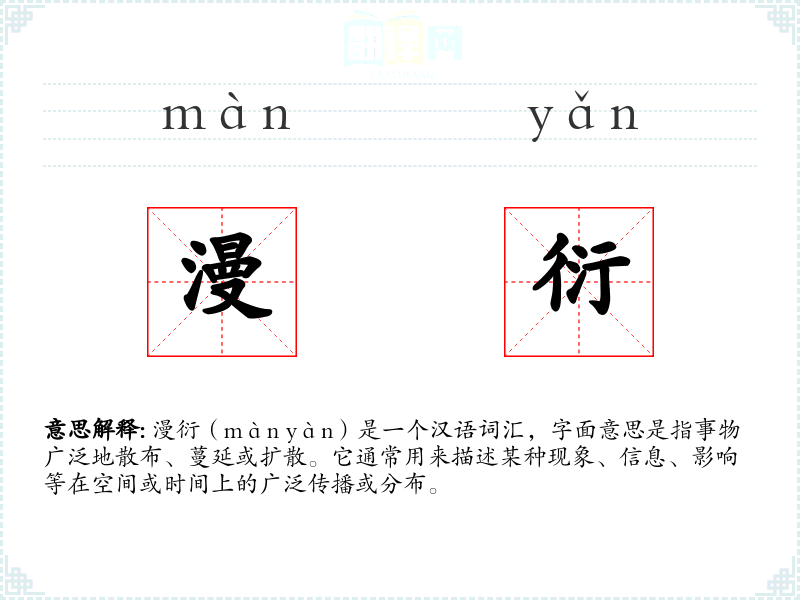 漫衍(màn yàn)是一个汉语词汇,字面意思是指事物广泛地散布、蔓延或扩散。它通常用来描述某种现象、信息、影响等在空间或时间上的广泛传播或分布。