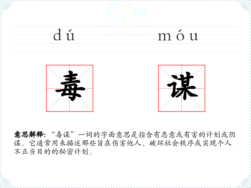 “毒谋”一词的字面意思是指含有恶意或有害的计划或阴谋。它通常用来描述那些旨在伤害他人、破坏社会秩序或实现个人不正当目的的秘密计划。