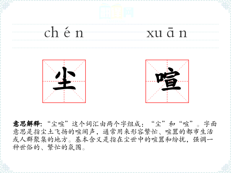 “尘喧”这个词汇由两个字组成:“尘”和“喧”。字面意思是指尘土飞扬的喧闹声,通常用来形容繁忙、喧嚣的都市生活或人群聚集的地方。基本含义是指在尘世中的喧嚣和纷扰,强调一种世俗的、繁忙的氛围。
