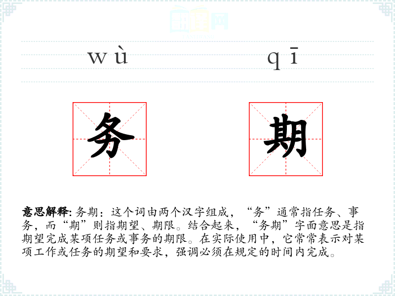 视觉上,“务期”可能让人联想到倒计时的钟表或紧张的工作场景。听觉上,可能让人想起紧迫的会议讨论或项目汇报的声音。