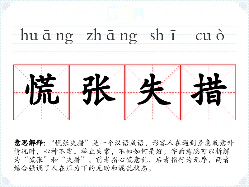 “慌张失措”是一个汉语成语,形容人在遇到紧急或意外情况时,心神不定,举止失常,不知如何是好。字面意思可以拆解为“慌张”和“失措”,前者指心慌意乱,后者指行为无序,两者结合强调了人在压力下的无助和混乱状态。