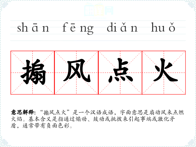 “搧风点火”是一个汉语成语,字面意思是扇动风来点燃火焰。基本含义是指通过煽动、鼓动或挑拨来引起事端或激化矛盾,通常带有负面色彩。