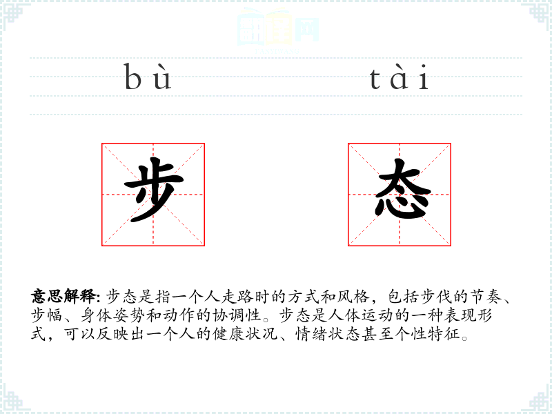 - 反义词:静止、不动(步态的反义词更多是指动作的停止而非相反的动作)