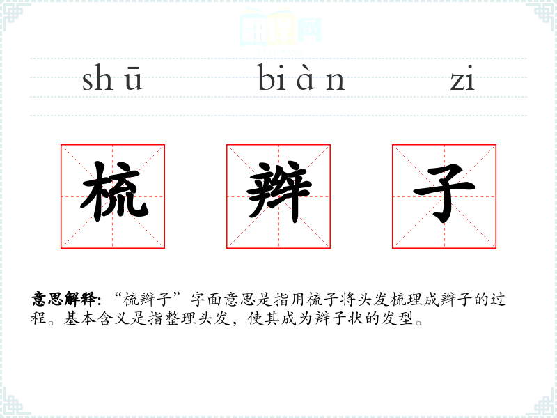 “梳辫子”一词源于汉语,其中“梳”指的是梳理头发的工具或动作,“辫子”则是指将头发编成的条状发型。这个词在汉语中有着悠久的历史,其基本含义和用法变化不大。