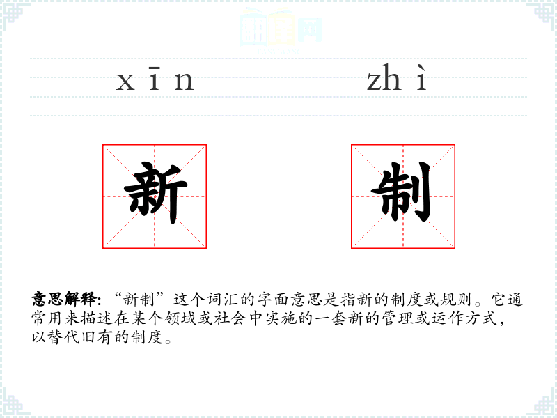 “新制”这个词汇的字面意思是指新的制度或规则。它通常用来描述在某个领域或社会中实施的一套新的管理或运作方式,以替代旧有的制度。