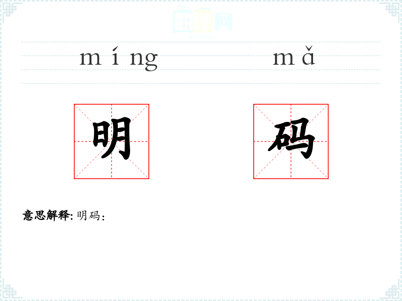 - 词源:明码一词源于中文,直接由“明”和“码”两个字组成,分别表示“清晰”和“代码”。