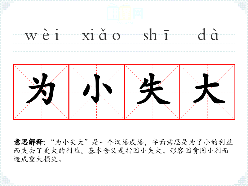 “为小失大”是一个汉语成语,字面意思是为了小的利益而失去了更大的利益。基本含义是指因小失大,形容因贪图小利而造成重大损失。
