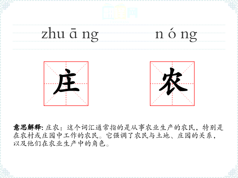 庄农:这个词汇通常指的是从事农业生产的农民,特别是在农村或庄园中工作的农民。它强调了农民与土地、庄园的关系,以及他们在农业生产中的角色。