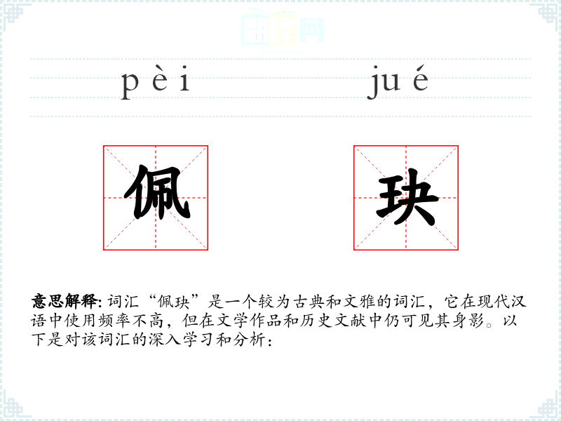 词汇“佩玦”是一个较为古典和文雅的词汇,它在现代汉语中使用频率不高,但在文学作品和历史文献中仍可见其身影。以下是对该词汇的深入学*和分析: