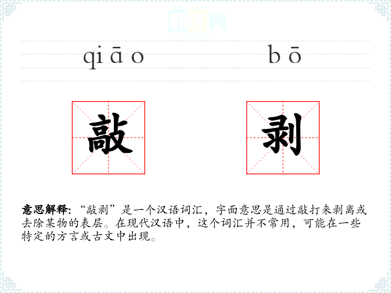 “敲剥”是一个汉语词汇,字面意思是通过敲打来剥离或去除某物的表层。在现代汉语中,这个词汇并不常用,可能在一些特定的方言或古文中出现。