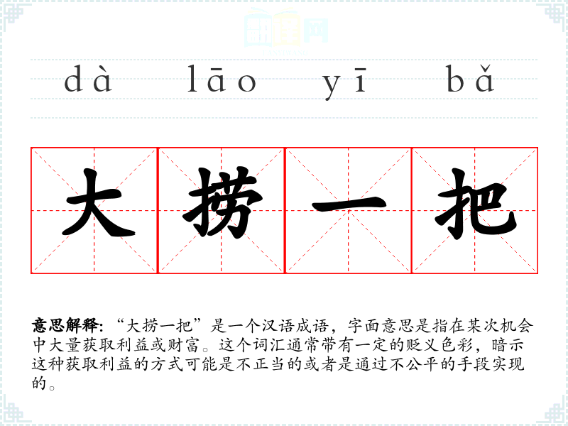 “大捞一把”是一个汉语成语,字面意思是指在某次机会中大量获取利益或财富。这个词汇通常带有一定的贬义色彩,暗示这种获取利益的方式可能是不正当的或者是通过不公平的手段实现的。
