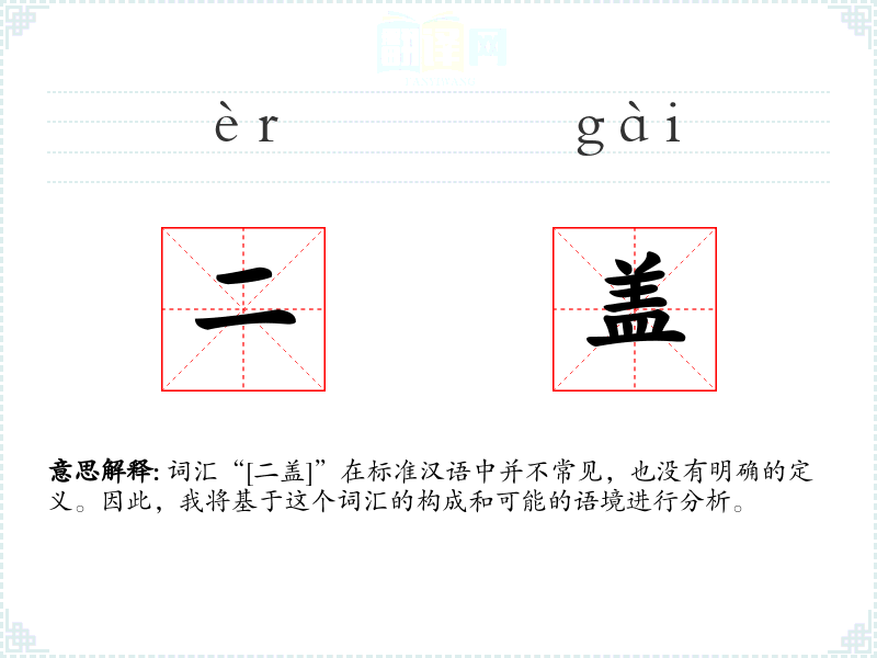 “二盖”这个词汇由两个汉字组成:“二”通常表示数字2,而“盖”可以有多种含义,如覆盖、盖子、盖章等。在没有具体上下文的情况下,这个词汇的字面意思并不明确。
