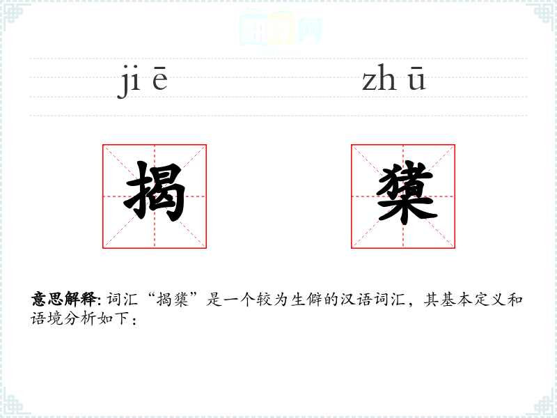 词汇“揭橥”是一个较为生僻的汉语词汇,其基本定义和语境分析如下: