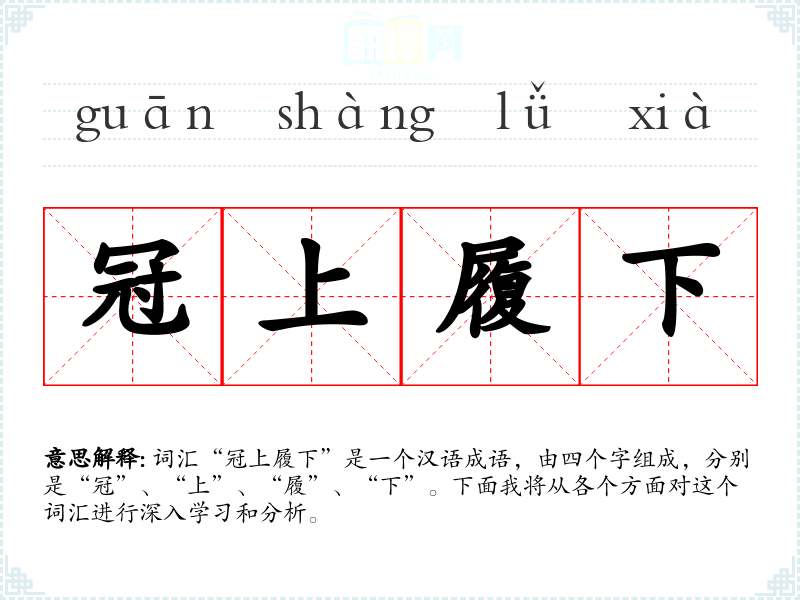 词汇“冠上履下”是一个汉语成语,由四个字组成,分别是“冠”、“上”、“履”、“下”。下面我将从各个方面对这个词汇进行深入学*和分析。