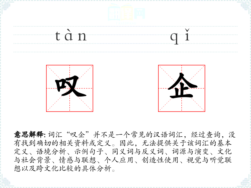 如果“叹企”是一个特定领域或方言中的词汇,可能需要更具体的上下文信息才能进行分析。如果这是一个打字错误或者是一个新兴的网络用语,那么可能需要更多的信息或者等待该词汇在语言社区中得到更广泛的认可和使用后,才能进行深入的分析。