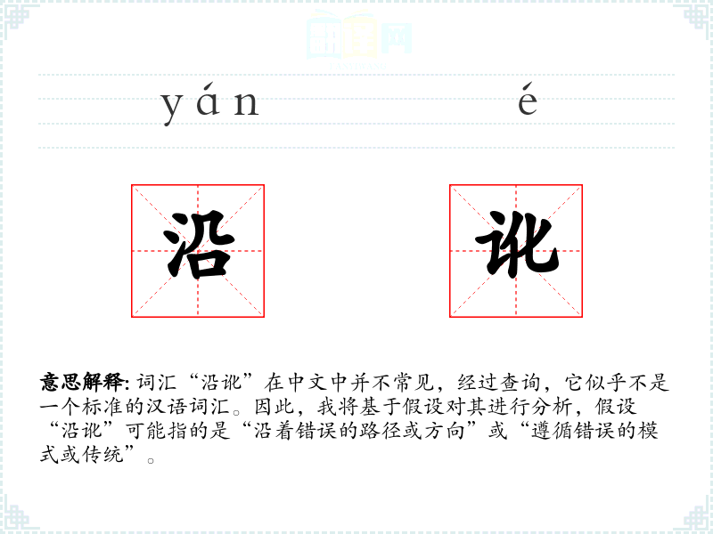 词汇“沿讹”在中文中并不常见,经过查询,它似乎不是一个标准的汉语词汇。因此,我将基于假设对其进行分析,假设“沿讹”可能指的是“沿着错误的路径或方向”或“遵循错误的模式或传统”。